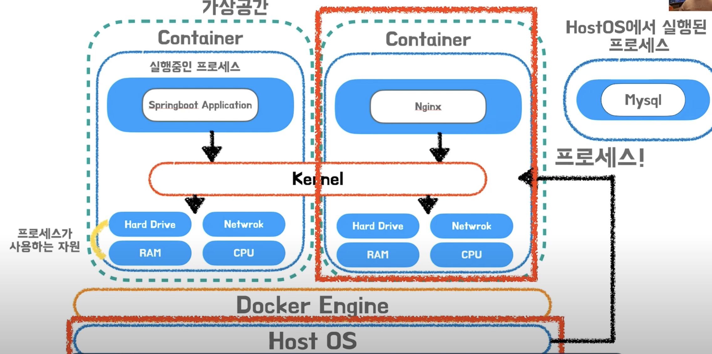 컨테이너는 파일시스템과 격리된 시스템 자원 및 네트워크를 사용할 수 있는 독립된 공간을 갖는다. 컨테이너가 실행되며, 프로세스가 실행되기에 필요한 자원들을 할당받고 프로세스를 실행한다. 이 때 커널을 통해 필요한 자원들을 가져온다.