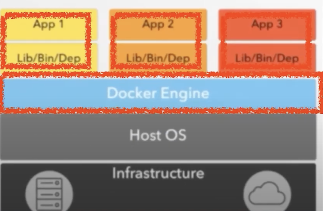 도커 엔진 위에 컨테이너가 할당되어 있다.