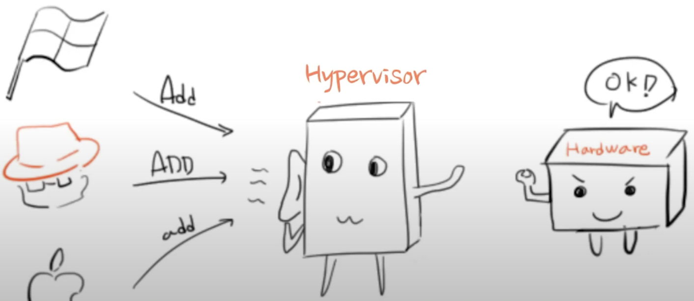 하이퍼바이저는 OS들에게 자원을 나누어주며 조율하는 역할을 한다. OS들의 커널을 번역해서 하드웨어에게 전달한다.