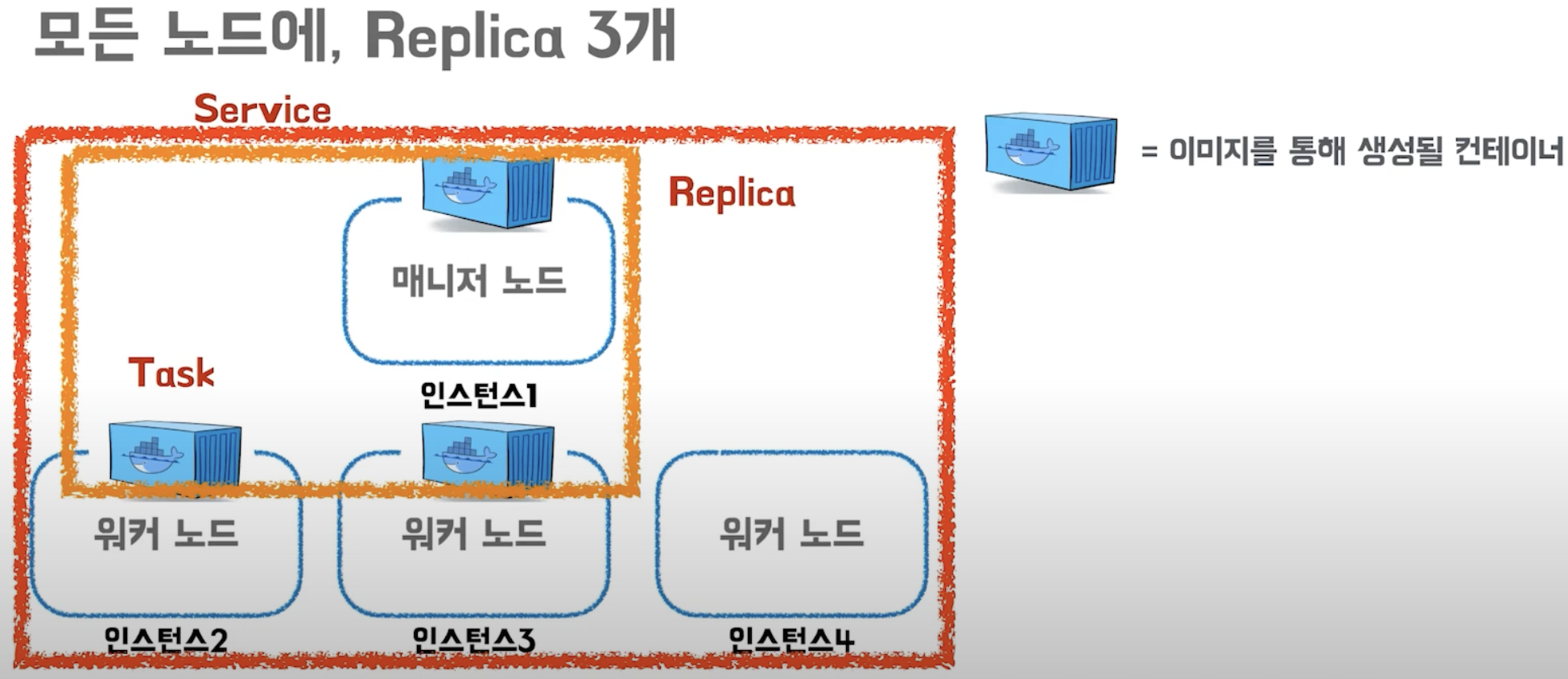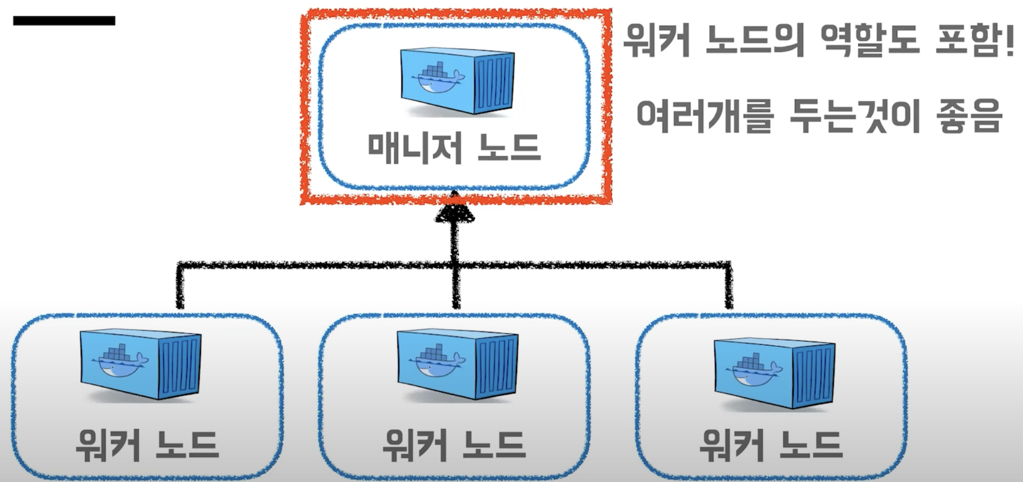 - 매니저 노드 : 워커 노드를 관리하기 위한 도커 서버
