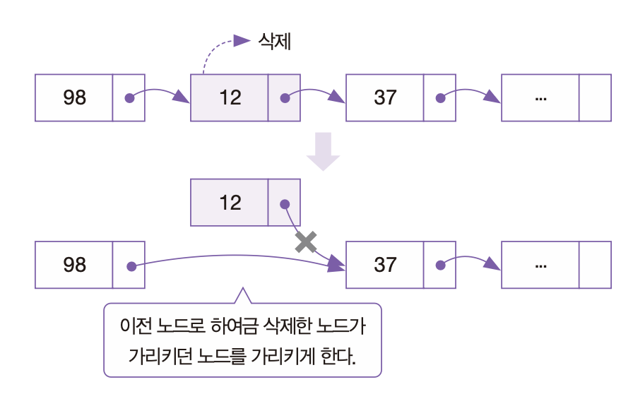 - 삭제하고자 하는 노드를 찾은 후 해당 노드의 다음 노드를 이전 노드의 NextNode 포인터에 연결하면 그 노드를 삭제할 수 있음