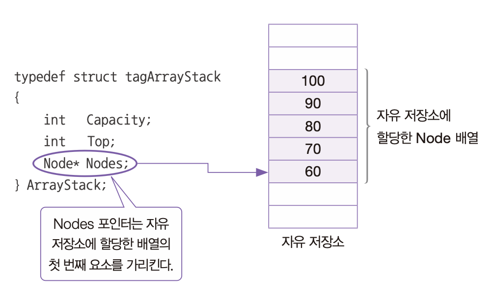 - 스택 구조체의 경우 용량, 최상위 노드의 위치, 노드 배열 총 3가지 필드를 가지고 있어야 함