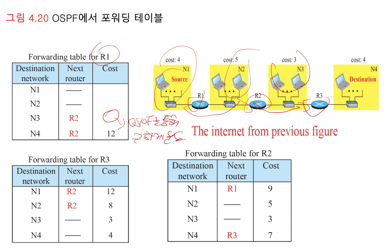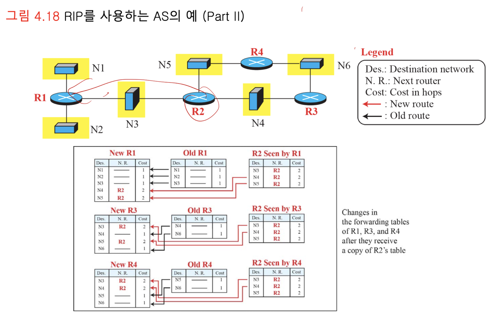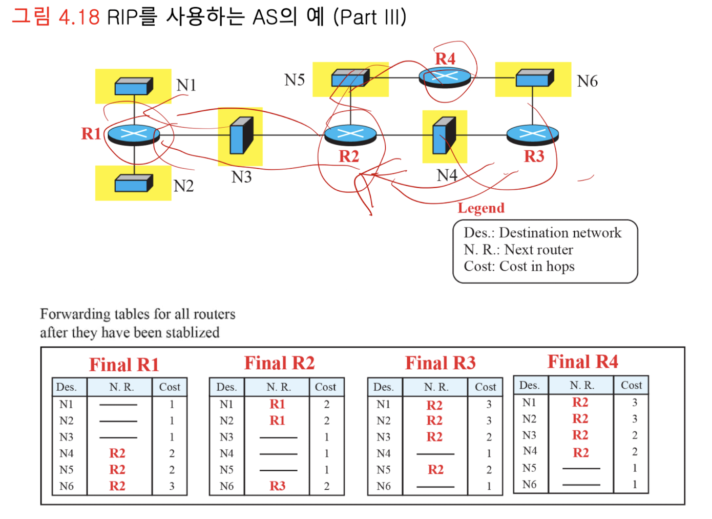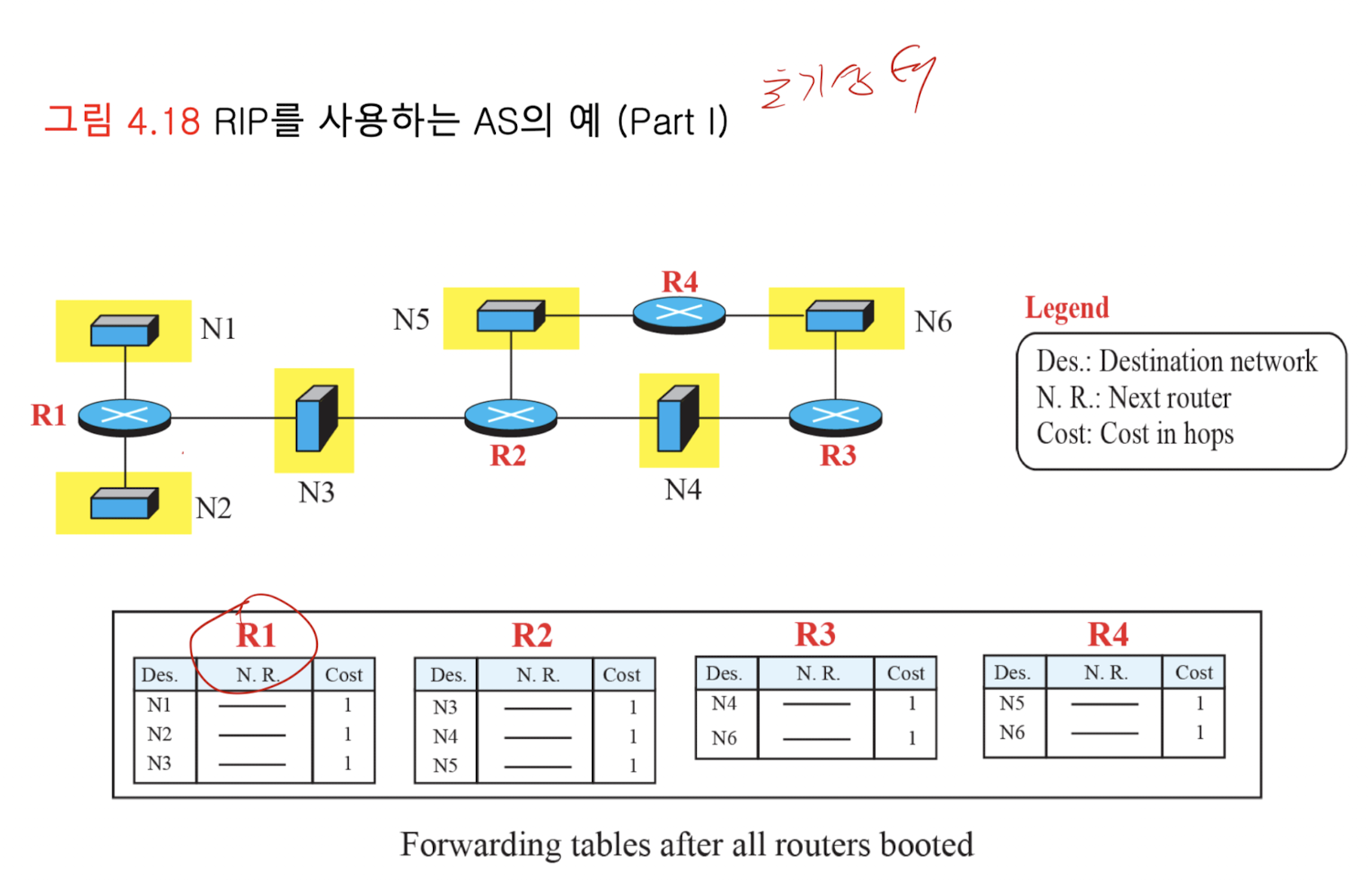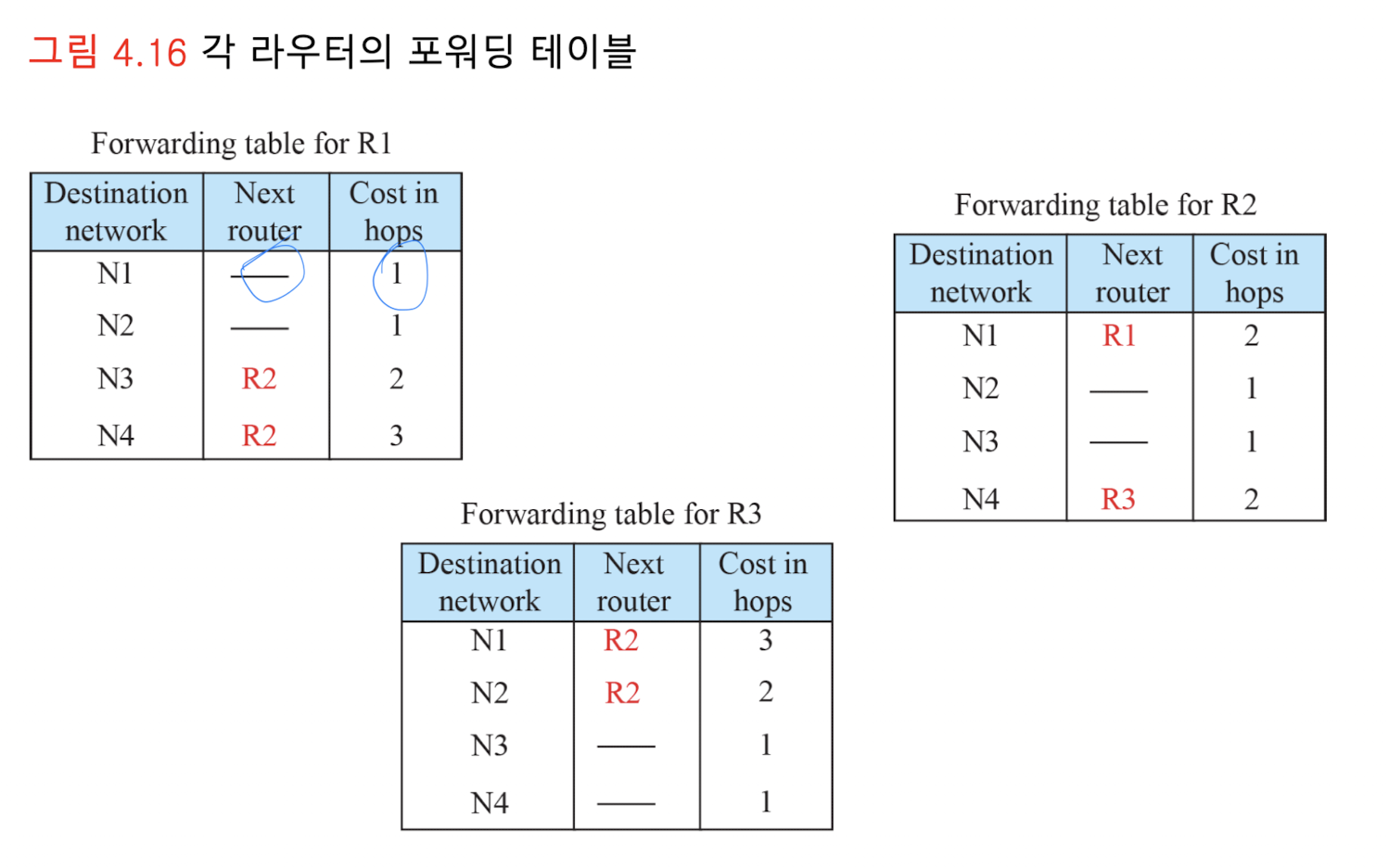 - 각 라우터의 포워딩 테이블에 도착지 네트워크, 다음 라우터, 홉 카운트(Cost in hops)를 저장