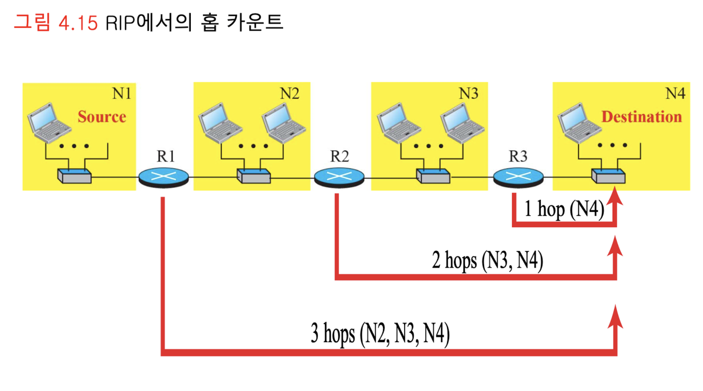 - RIP는 가장 널리사용되는 거리-벡터 라우팅 알고리즘 기반의 도메인 내(intradomain) 라우팅 프로토콜