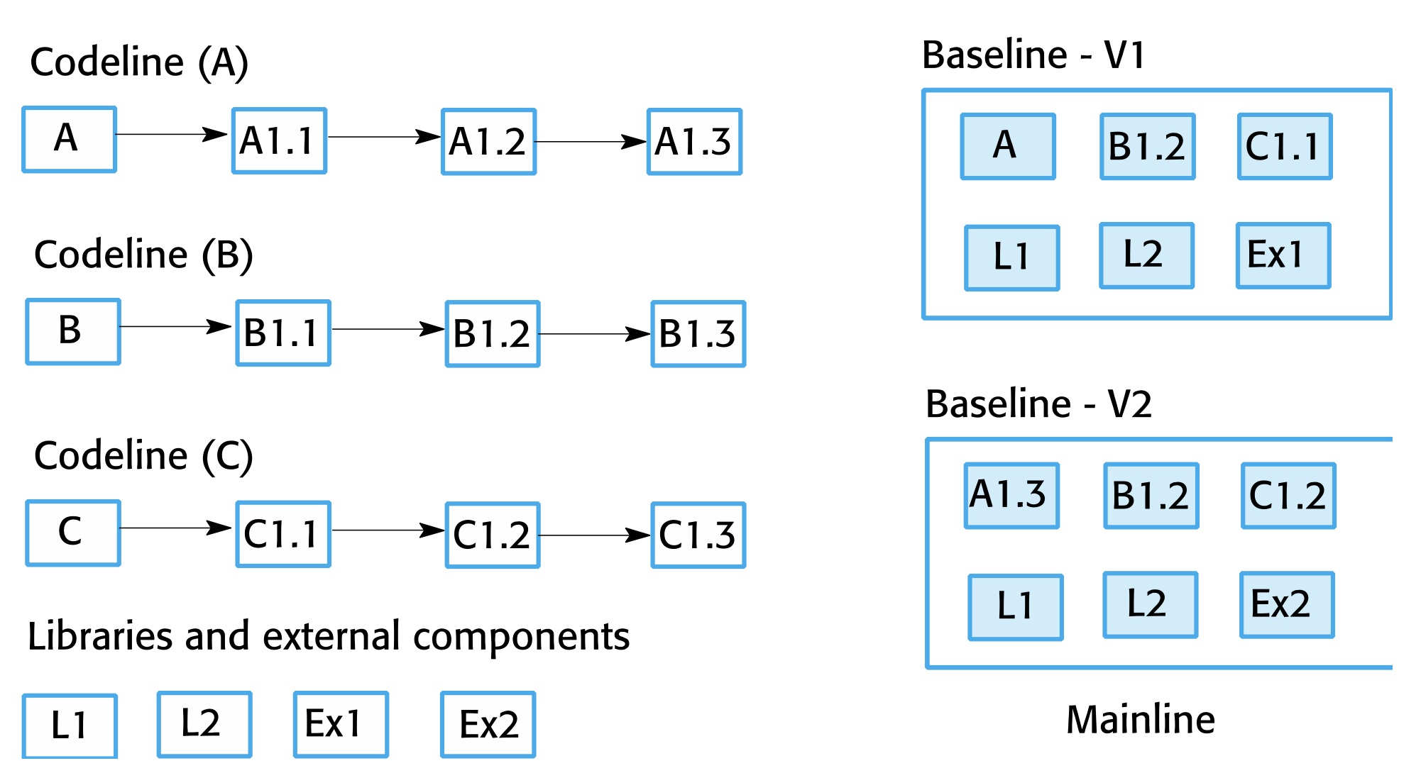 - 어떤 단계에서는 모든 변경 사항을 포함하는(includes all changes that have been made) 구성 요소의 새 버전을 만들기 위해 코드라인 브랜치를 병합해야 할 수도 있습니다(it may be necessary to merge codeline branches).