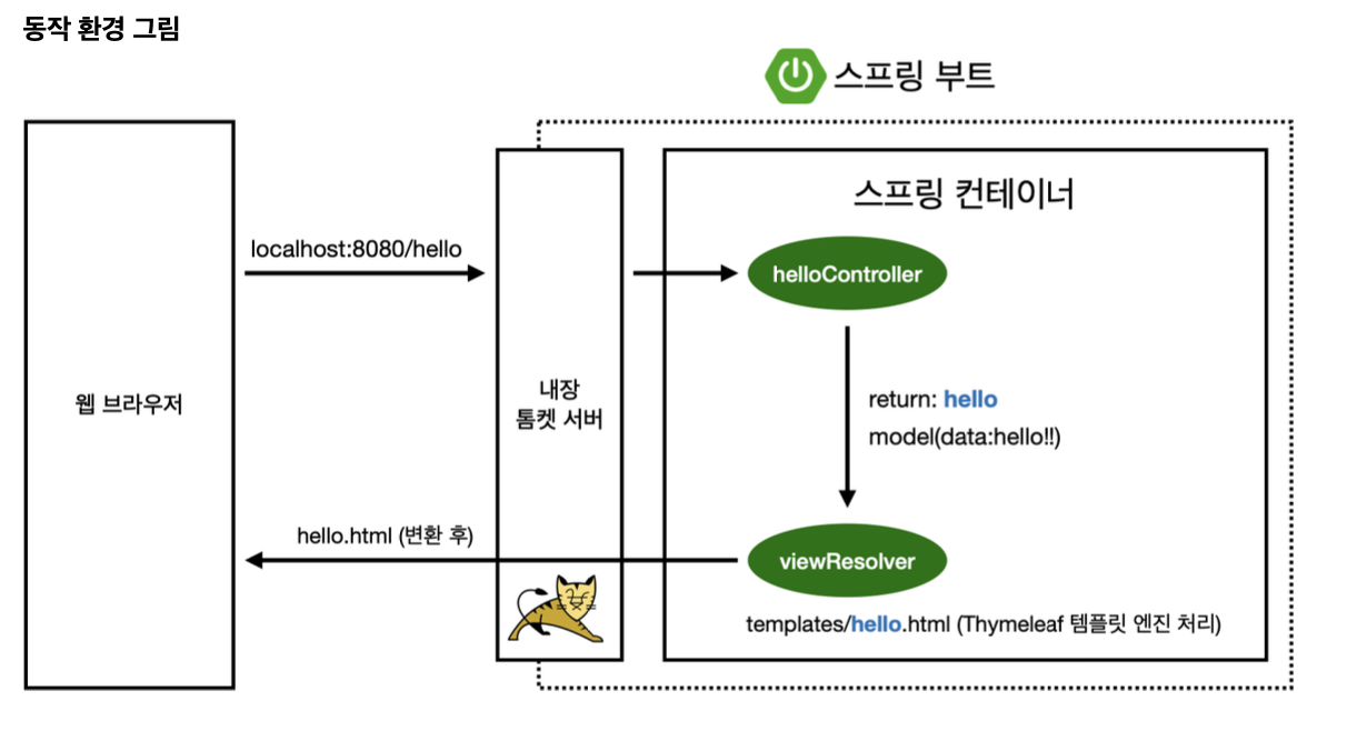 - http://localhost:8080/hello 에서 /hello를 던지면 Spring Boot의 Tomcat 서버에서 슬롯이 Hello임을 확인하고 Spring에게 질의